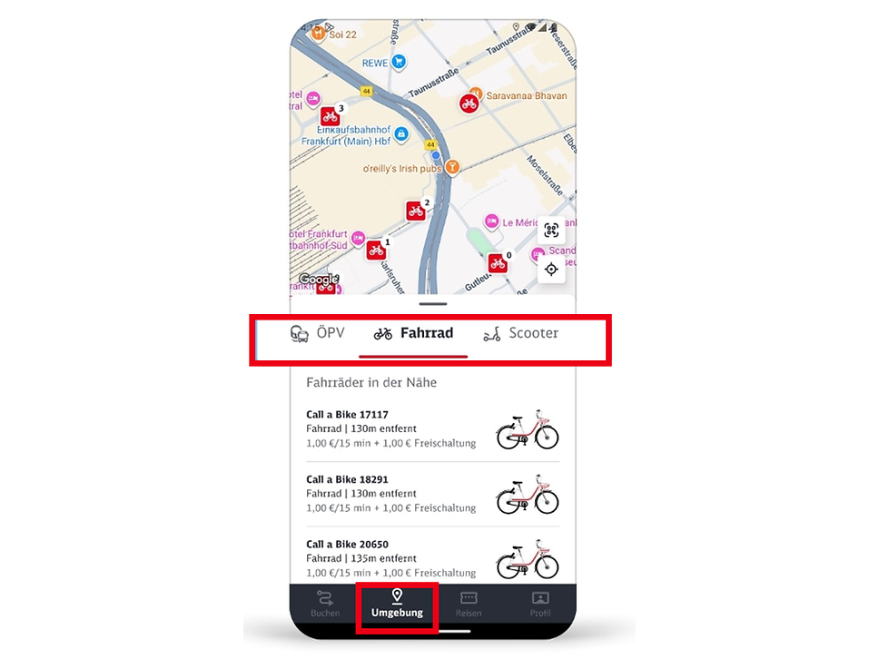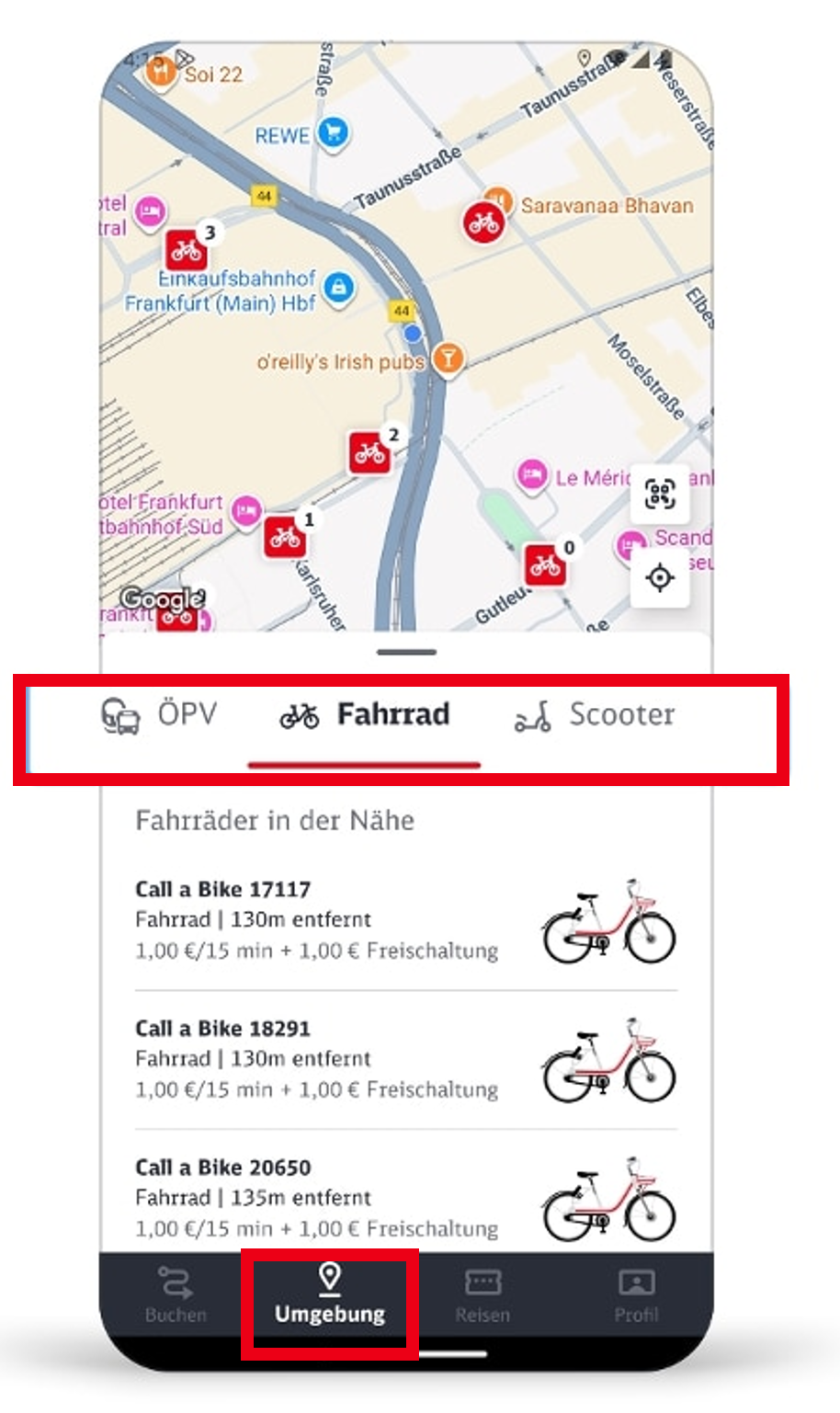 - Hier sehen Sie Ihren aktuellen Standort sowie, falls gewünscht, den Fußweg zu nahegelegenen Bahnhöfen, Haltestellen, verfügbaren Fahrrädern (Call-a-Bike) oder Scootern (Dott).
