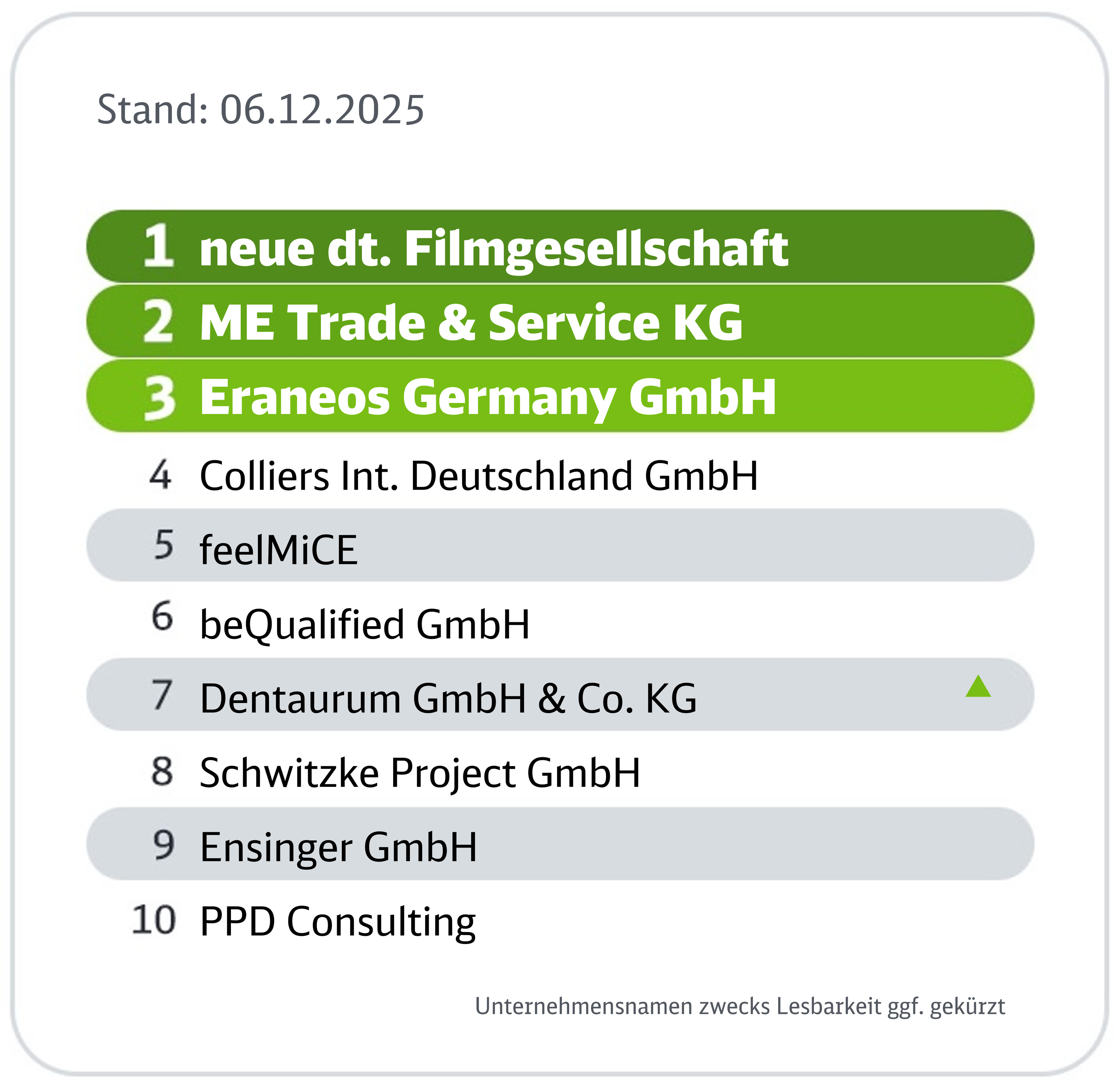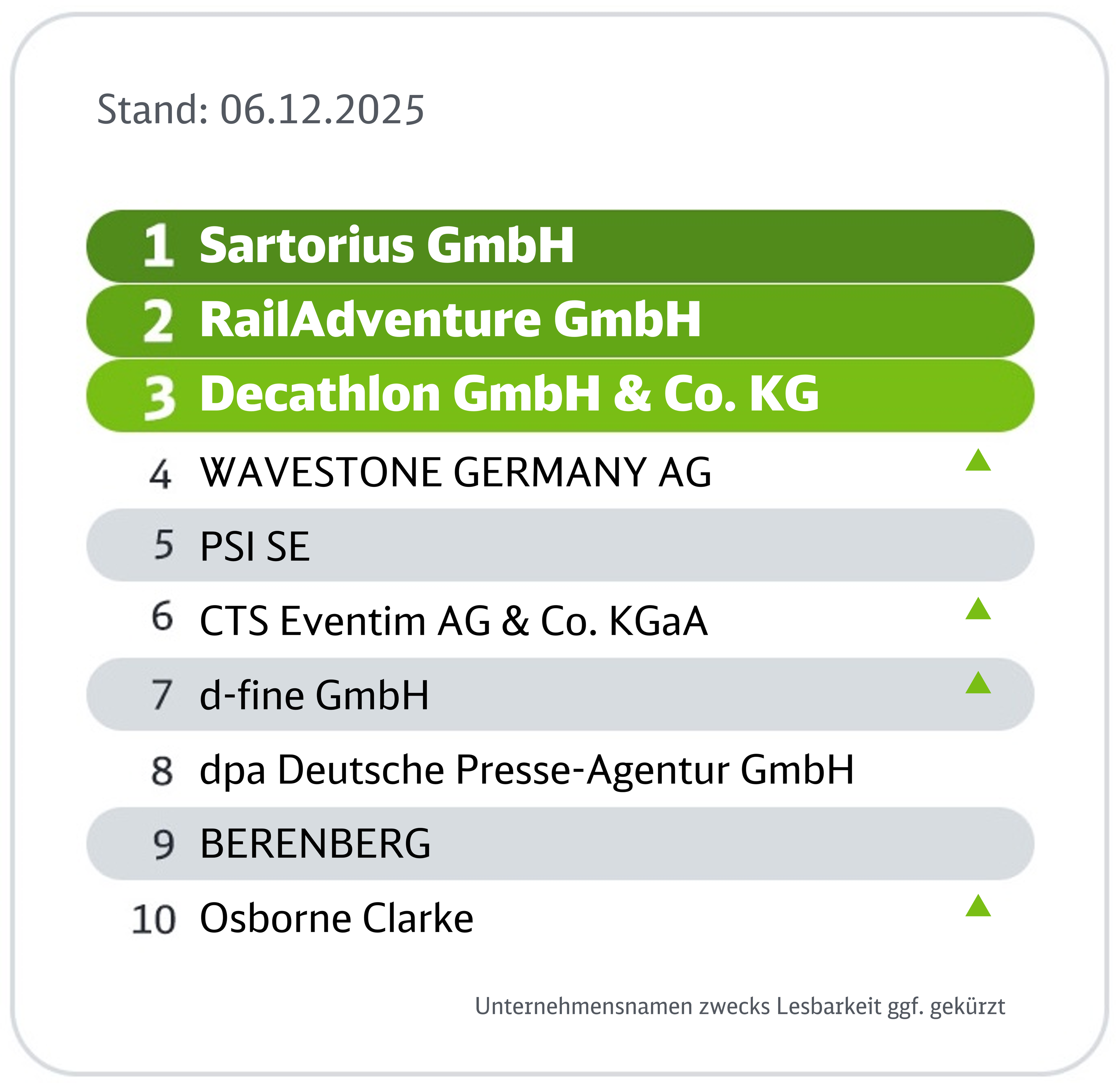 Wöchentlich sehen Sie hier das aktualisierte Ranking! In den Kategorien Champions, Premium und Smart werden jeweils die Top 10 Unternehmen vorgestellt. Es lohnt sich, vorbeizuschauen und die Fortschritte zu verfolgen.Die bahn.business Verantwortlichen aller teilnehmenden Unternehmen erhalten außerdem regelmäßig ein individuelles Ranking per E-Mail.