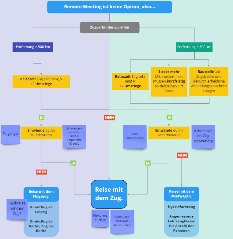 Die Reiseregelung wurde 2020 finalisiert und bildet seitdem bei jeder Dienstreise die Grundlage. Sie ist allen Kolleg*innen als Entscheidungsbaum zugänglich, der außerdem dazu anregt, bei weiten Reisen oder notwendigen Flügen doch direkt Zeit für einen kleinen Urlaub vor Ort einzuplanen – wenn man einen weiten Weg zurücklegen muss, dann sollte die Zeit vor Ort effektiver als nur für ein Meeting genutzt werden. Darüber hinaus werden allen Vielreisenden eine BahnCard 50 zur Verfügung gestellt, die auch für die ein oder andere private Fahrt eingesetzt werden darf.
