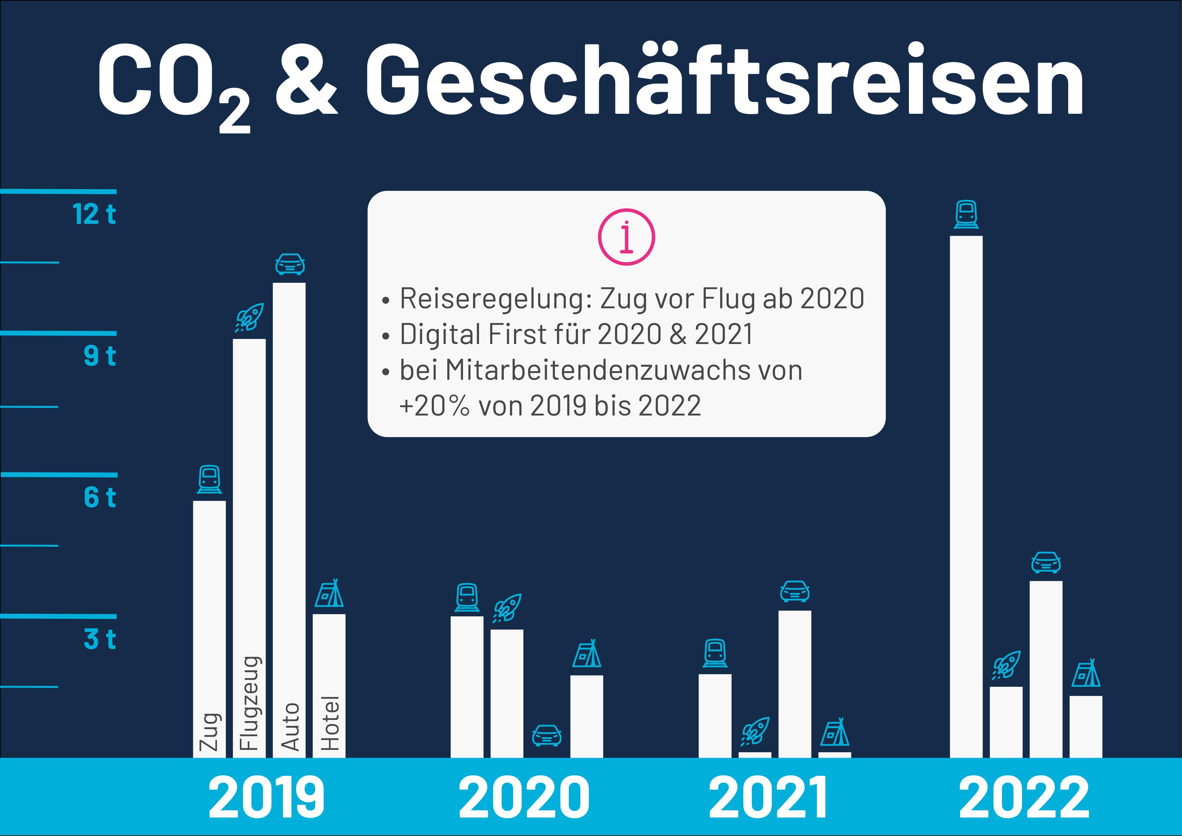 Das Sichtbarmachen der Mobilität unserer Kolleg:innen und deren Auswirkung ist für uns eine Herausforderung, die wir seit einiger Zeit angehen. Wir messen unseren CO2-Fußabdruck seit 2019 und konnten durch die Corona-Zeit (Pendeln vs. Home Office) und unsere Reiseregelung deutliche Verschiebungen in unserer Bilanz beobachten. Da wir bereits seit 2019 eine sehr gute Pendelbilanz dank ÖPNV und Fahrrad hatten, hat sich die Corona-Zeit durch das Home Office eher negativ auf die Bilanz ausgewirkt – denn das Zuhausebleiben und gleichzeitige Betreiben von Büroflächen erzielte eine Verdopplung. Im Gegensatz dazu zeigte sich durch die Reiseregelung („Zug vor Flug“ sowie „Digital First“) trotz Mitarbeiter:innenzuwachs und damit einer Zunahme von Meetings eine Reduktion von 30 % an CO2 (27 t in 2019 vs. 18 t in 2022) – und geht man von den versprochenen 100-%-Ökostrom-Zügen im Rahmen der zur Verfügung gestellten BahnCards aus, so wäre der Fußabdruck 2022 aufgrund von Geschäftsreisen nur noch bei weniger als 7 t – bei über 90 Kolleg:innen eine für uns sehr positive Entwicklung.