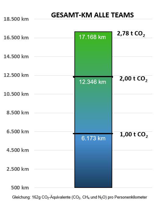 Darüber hinaus hatten wir als Zielmarke ausgerufen, so viele Kilometer mit dem Rad „sammeln“ zu wollen, dass sie einer Tonne Treibhausgase entsprechen, wenn man die Wege stattdessen mit dem Auto zurückgelegt hätte (162 g pro Personenkilometer, laut Umweltbundesamt), um den Umweltaspekt greifbar zu machen.
