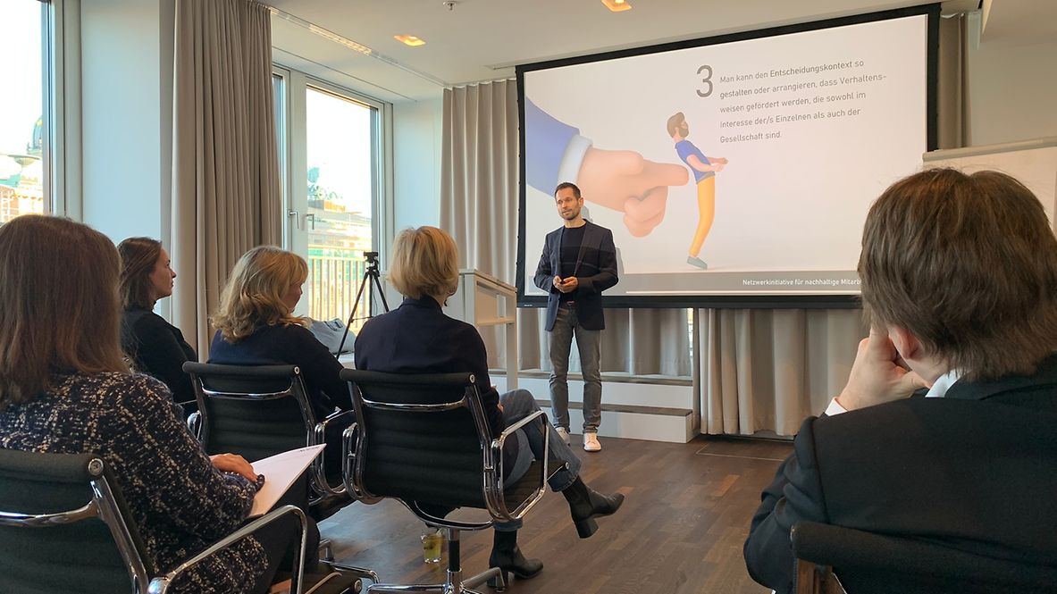 Wo wir beim Thema „Green Nudging“ wären. Dabei sollen Menschen durch Nudges (Stupser) sanft zu einem bestimmten Verhalten gelenkt werden. Nudges sollen helfen, ökologisches Verhalten zu vereinfachen und Gewohnheiten zu durchbrechen. Denn: Viele Menschen finden Umweltschutz gut und wichtig, setzen diese Einstellung aber nicht in ihrem Alltag um. Um zunächst einmal alle ins Boot zu holen, erklärte Dr. Arndt Pechstein den Begriff genauer und gab anschauliche Beispiele – was im Publikum für erste Aha-Momente sorgte.