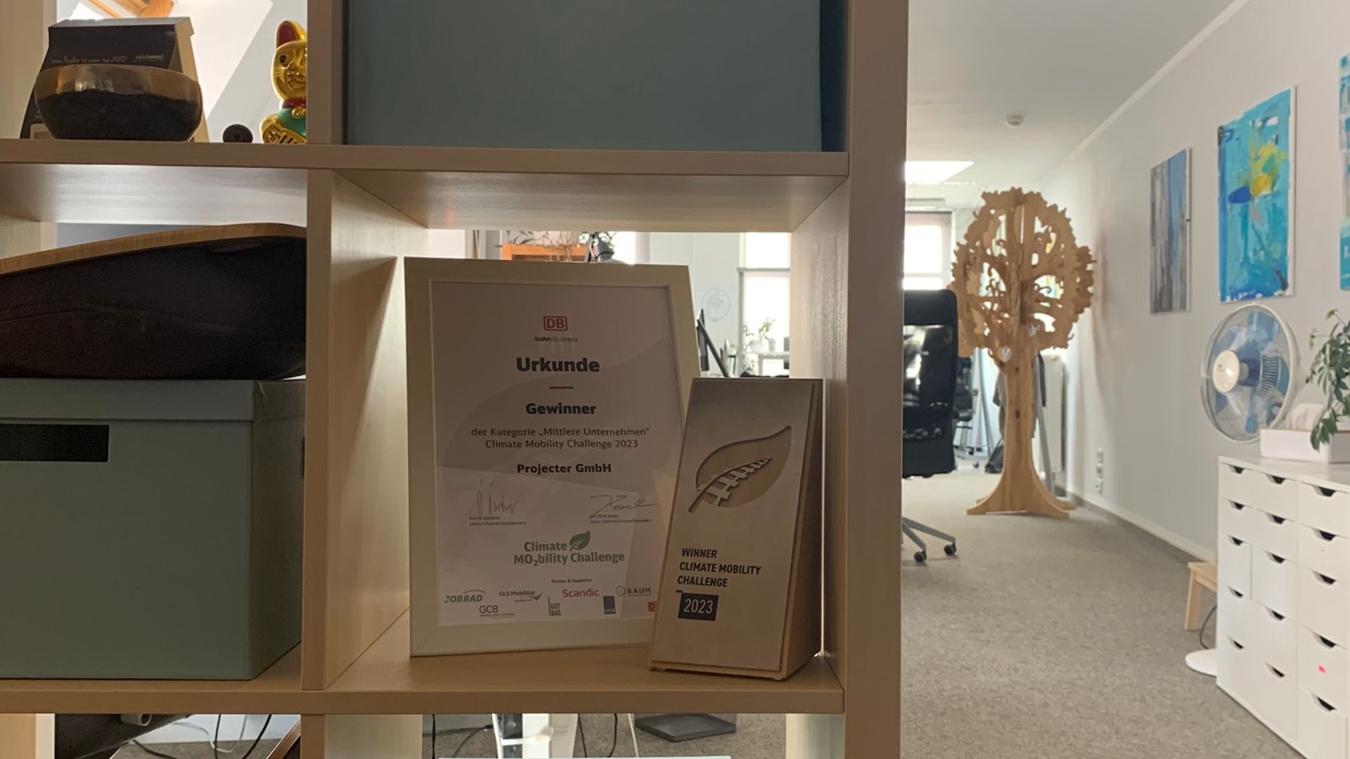 Beim Reinkommen haben wir schon die Spuren der CMC gesehen, der Preis in der Kategorie „Mittlere Unternehmen“ steht für alle sichtbar in der Sitzecke, die Falträder noch ganz frisch aufgebaut.